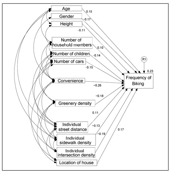 We also ran a path analysis for biking. Figure 4 shows the significant parameters that were estimated. Gender (0: female and 1: male), height, the number of children, the number of cars, concerns about convenience, greenery density, individual sidewalk density, and intersection density all negatively influenced the frequency of biking. Age, the number of household members, and the individual street distance all positively influenced the frequency of biking.