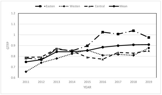 MaxDEA8 software was used to process the data of 30 provinces to obtain the efficiency value of GTFP of manufacturing in 30 provinces from 2011 to 2019, which were then divided into eastern, central, and western regions. The average GTFP of the manufacturing industry was calculated, which intuitively reflected the GTFP of China’s three major regional manufacturing industries from 2011 to 2019. In order to directly reflect the GTFP of the manufacturing industry in the three regions of China, a line chart of GTFP values for the manufacturing industry in China from 2011 to 2019 is drawn.