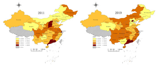 To further illustrate, we compare the GTFP efficiency values in 2011 with those in 2019 in Figure 2 and find that the regions with higher GTFP values in 2011 are concentrated in the Yangtze River Economic Belt, Guangdong, and Shanxi. Nevertheless, in 2019, the gap between regions narrowed significantly, and the GTFP of the manufacturing industry gradually developed in a balanced direction. However, by analyzing only the trend of GTFP in the manufacturing industry in eastern, central, and western China, it is impossible to deeply explore the intrinsic correlation of GTFP in the manufacturing industry of various provinces and cities. Therefore, it is necessary to conduct a spatial analysis of the interaction of GTFP in manufacturing in different regions.