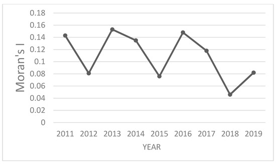 Using ArcGIS software, the inverse distance squared matrix is used as the spatially correlated weight matrix to calculate Moran’s I index value of China’s manufacturing GTFP from 2011 to 2019, as shown in Table 3. The global Moran’s I index was positive for all years, indicating that China’s manufacturing GTFP has a positive spatial spillover effect. Moreover, from Moran’s I index chart in Figure 3, Moran’s I index fluctuates in the range of 0 to 0.2, indicating that China’s manufacturing GTFP has a positive spatial spillover effect.