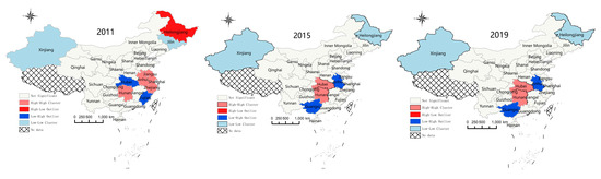 LISA map of manufacturing industry’s GTFP in 2011, 2015, and 2019.