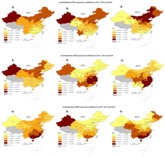 In addition, the impact of technology investment on GTFP is shown in Figure 5c. It can be seen that the impact of R&D investment on manufacturing GTFP in southeast China is higher than that in other regions, especially in Guangdong, Guangxi, and Hainan, with coefficients of more than 0.5. From 2011 to 2019, the impact coefficient of national R&D investment on manufacturing GTFP increased from −1.25 to 0.12, and the impact on manufacturing GTFP turned from negative to positive. This is due to the proposal of the “13th Five-Year Plan”, and the emphasis of the 18th National Congress of the Communist Party of China on innovation and green as the development concept and provinces are paying more and more attention to innovation-driven green economic development.