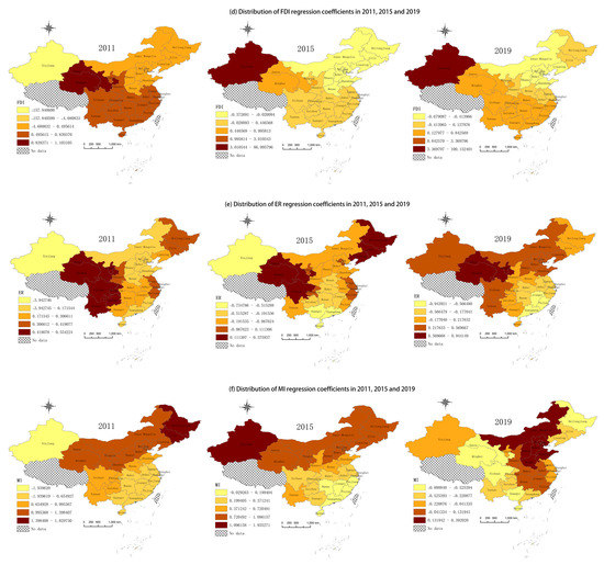 As shown in Figure 5d, in 2011, the FDI regression coefficient was positive in all regions except Xinjiang. After 2011, with China’s emphasis on environmental protection and sustainable development, the government began to rectify foreign-funded, pollution-intensive enterprises, with the Beijing–Tianjin–Hebei urban agglomeration as the core, and the quality of foreign direct investment continued to improve, thus providing various necessary support for the green development of industrial manufacturing.
