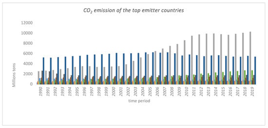 Policymakers first check for the existence of a normal environmental Kuznets curve and, in case one exists, whether the turning point has been achieved or not while identifying the relationship between GDP and CO2 outflows. If the turning point has been achieved, then higher economic growth will not affect an increasing level of CO2 emissions []. After a while, industrialized countries began to organize substantial environmental agreements and agendas to reduce and manage GHG emissions and their concentrations in the atmosphere []. The estimated entire cost of the changing climate due to CO2 emissions is proportional to around 5% of economic growth every year and is projected to reach 20% by the end of the year if rigorous actions are not be adopted []. Recent statistics on CO2 emissions with respect to the share of the top-emitting countries are depicted in the following graph (Reported by IEA in August 2020).