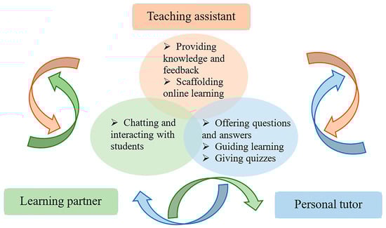 Chatbots perform three roles in education, i.e., teaching assistants, learning partners, and personal tutors. Inspired by Li and Yu [14], the authors summarized the role of chatbots in Figure 1. Operating as a teaching assistant, the chatbot mechanism provided professional knowledge and formative feedback [15] and scaffolded students’ online learning [16]. Chatbots, as learning partners, chatted and interacted with students through either texts or voices. The tutorial role required chatbots to offer questions and answers, guided students to start their learning [17], and give quizzes [18]. The three educational roles of chatbots are intertwined with each other, contributing to effective teaching and learning [14,19]. Given the function of chatbots, it is most likely that chatbot-based education would positively and significantly influence critical thinking, explicit reasoning, learning achievement, knowledge retention, engagement, motivation, and interest.