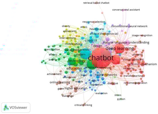 At the beginning, the authors determined search keywords by clustering the literature. They obtained 741 results in the Web of Science by keying in the research themes “chatbot” AND “learning”. The results were output in the form of plain texts and imported into VOSviewer. The type of analysis was co-occurrence, and the unit of analysis was all keywords. The minimum number of occurrences of a keyword was set at three. Of the 2295 keywords, 217 met the threshold and were categorized into 11 clusters (Figure 2). The researchers obtained the top 10 frequently-occurring keywords: chatbot (N = 340), artificial intelligence (N = 96), machine learning (N = 90), chatbots (N = 89), deep learning (N = 81), natural language processing (N = 73), conversational agents (N = 36), conversational agent (N = 28), education (N = 24), and technology (N = 23).