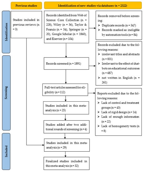 The authors obtained 2322 studies from online databases on 3 September 2022. The major databases included Web of Science, Wiley Online Library, Springer Link, Taylor & Francis Online, Elsevier ScienceDirect, and Google Scholar (Figure 3). Considering the above findings of bibliometric analysis and the aim of this study, the researchers retrieved 228 results by entering the topic terms: (chatbot OR “conversational agent”) AND (education OR learn* OR teach*) AND (“control group” OR experim* OR experient*) from Web of Science Core Collection. They also obtained 56 results from Wiley and 54 results from Taylor & Francis by keying in “chatbot OR conversational agent” AND “education OR learning OR teaching OR control OR experiment” in the Abstract. Researchers obtained 20 records from Springer and 1860 results from Google Scholar by entering in “chatbot” in where the title contains AND “control group” in with the exact phrase AND “education OR learn OR teach” in with at least one of the words. Researchers also retrieved 104 studies by keying in “chatbot OR conversational agent” in the Title AND “education OR learning OR teaching OR control OR experiment” in Title, abstract, keywords from Elsevier.