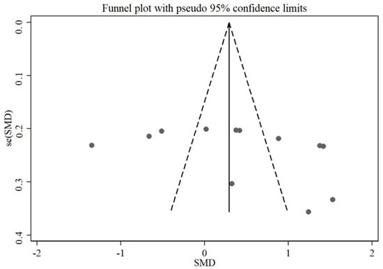 Both Egger’s and Begg’s tests (Table 3) checked whether the identified studies were influenced by publication bias. The results of both tests indicated the absence of publication bias in critical thinking (t = 14.17, p = 0.111; z = 1.47, p = 0.142), explicit reasoning (t = 1.90, p = 0.424; z = 1.32, p = 0.188), learning achievement (t = 4.36, p = 0.083; z = 0.53, p = 0.598), knowledge retention (t = 10.18, p = 0.061; z = 1.47, p = 0.142), learning engagement (t = −0.14, p = 0.946; z = 1.35, p = 0.176), and learning motivation (t = 8.17, p = 0.216; z = 1.23, p = 0.217). The funnel plot also confirmed test results (Figure 4). Using learning motivation as an example, the funnel graph was obviously symmetrical, revealing no publication bias. However, Begg’s test showed a presence of publication bias in learning interest (z = 2.04, p = 0.042), which was different from the result of Egger’s test (t = 15.30, p = 0.056).