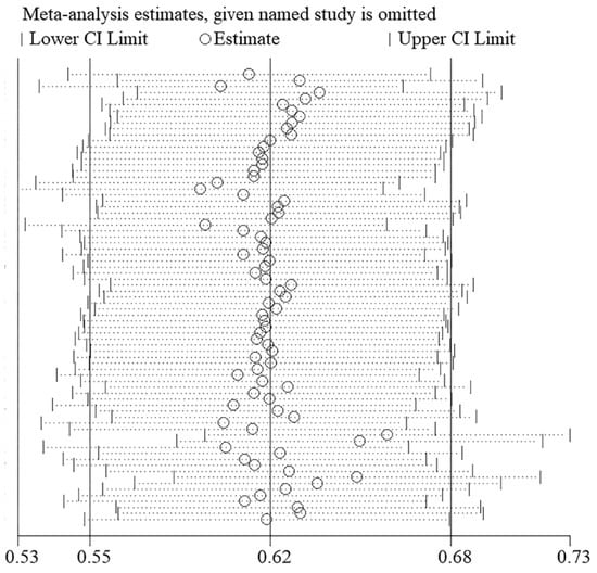 The researchers implemented a sensitivity analysis to examine the stability of meta-analytical results. As shown in Figure 5, all estimates range from the lower confidence interval limit (95% CI = 0.55) to the upper confidence interval limit (95% CI = 0.68). It indicates that none of the included studies could influence the pooled effect size when a specific study is omitted, confirming that the meta-analytical results are robust.