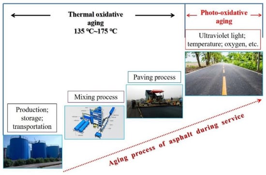Asphalt is a type of complex high-viscosity polymer dispersed phase. In the process of construction and service, environmental factors such as light, water, and the action of vehicle loads change the asphalt chemical composition and molecular structure, which leads to asphalt aging [52].