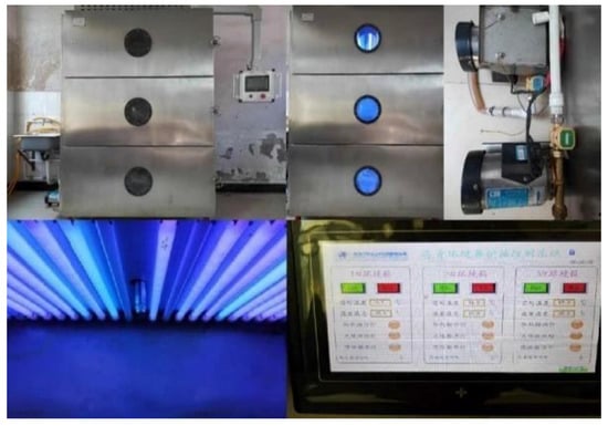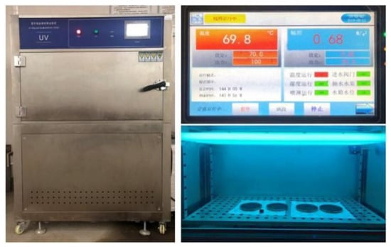 The bespoke aging test method is mainly intended for evaluating the photo-oxidative aging of asphalt. As research on the photo-oxidative aging of asphalt is still fairly recent, a unified test specification has not been established yet, and no standard procedures for UV aging tests is available [20]. Thus, researchers have designed various aging test methods to obtain asphalt aging samples after photo-oxidative aging. In the preparation process, factors such as light-wave wavelength, test sample thickness, and radiation duration have been considered [52,53]. Hu et al. [54] employed UV light belonging to wavelength ranges of 260–300 nm, 300–350 nm, and 350–400 nm to investigate the effects of radiation on asphalt with a fixed film thickness (1.13 mm) for 2 days, 4 days, and 8 days; they also prepared asphalt aging samples to study the influence of wavelength and aging cycles on such samples. Zeng et al. [55], Mouillet et al. [56], Xiao et al. [57], and Xu et al. [58] obtained aging samples using an indoor homemade UV aging chamber (Figure 2), although some differences existed in the aging parameters. In addition, some researchers [59] adopted a climate simulation system (Figure 3), comprehensively considering the coupling effect of light, heat, water, and other environmental factors on asphalt, and simulated the aging process of asphalt binder during the actual service live of asphalt pavement to obtain asphalt samples resembling actual aged asphalt more closely.