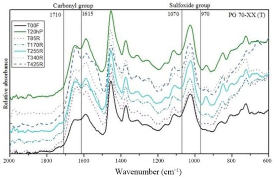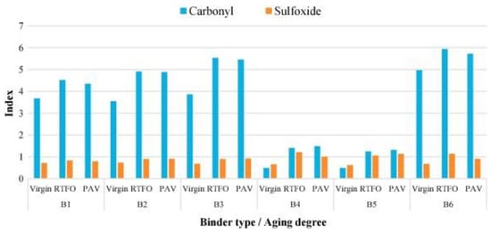 Currently, the FTIR is popular in identifying the types and contents of SBS within the SBS modified asphalt [113]. This study discusses the application of FTIR in the field of asphalt aging. Furthermore, it can be used to determine the chemical change with asphalt as per the change of functional groups [113,114]. Among them, the peak values corresponding to the 1700 cm−1 carbonyl and 1032 cm−1 sulfoxide eigenfunctions exhibited the most significant changes (Figure 10) [8]. Researchers have proposed changes in the carbonyl index (C=O) and sulfoxide index (S=O) to evaluate the degree of asphalt aging, as shown in Equations (2) and (3) [49]; these equations can denote that carbonyl and sulfoxide groups are generated during ageing process due to oxidation. Zhao et al. [115] and Li et al. [116] studied changes in the functional group index of asphalt after aging using RTFOT, PAV, and UV; they found that both the carbonyl (C=O) and sulfoxide indexes (S=O) increase with the degree of aging and that the former is particularly correlated with the degree of aging, whereas the latter is not. In addition, through FTIR, Yao et al. [34] conducted a detailed analysis of functional groups with a wavelength of 1700 cm−1 in the asphalt aging process; they found that carboxylate and ketone groups are the main products in the asphalt aging process and that these functional groups, generated after aging, have a significant effect on the high-temperature related diseases such as rutting and fatigue performances of the asphalt mixture.