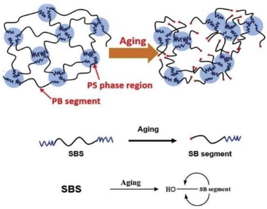 In modified asphalt, the degradation of the modifiers [75,76,77,78], such as the SBS modifier, occurs in addition to the aging of the asphalt phase. Studies conducted by Fang et al. [79], Zhou et al. [80], Gao et al. [81], Yu et al. [82], and Wei et al. [83] have shown that aging under high temperature, water, and other external conditions simultaneously promotes the degradation of the SBS polymer and polymerisation of the small asphalt molecules (Figure 5). As the degree of aging continues to increase, the network structure of the SBS polymer modifier is gradually degraded until the modification function is lost, which significantly affects the physical and rheological properties of the asphalt. Zhou et al. [84] conducted an in-depth exploration of the aging of SBS-modified asphalt at the microscopic scale. SEM analysis revealed that the surface of the aged base asphalt and SBS/styrene-butadiene rubber (SBR)-modified asphalt exhibited a large number of wrinkles (bee-like structure) during the asphalt aging process, which directly led to a decline in the macroscopic road performance of asphalt.