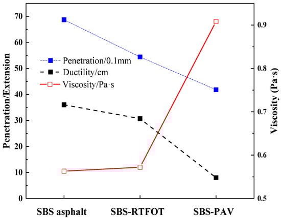 The fundamental physical properties include three basic indexes, namely needle penetration, elongation, Fraaß breaking point, and softening point, which are determined based on ASTM D36, ASTM D5, and ASTM D113 standard tests, respectively [85,86]. In addition, viscosity represents the fluidity index of asphalt at a certain temperature, which can be measured using a Brookfield viscometer according to ASTM D4402 [87,88]. Zhou et al. [84] had investigated how the conventional properties change with ageing using TFOT, RTFOT, and PAV, as shown in Figure 6. The results showed that aging has a significant effect on the basic physical properties of asphalt.