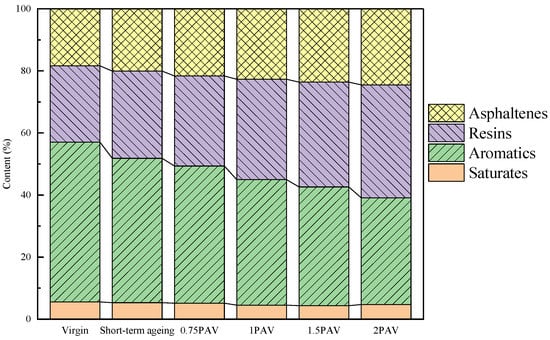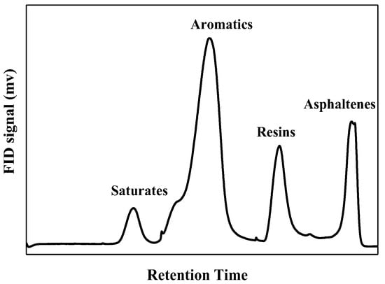 In the aging process of asphalt, the internalisation groups transform into each other, exhibiting different transformation laws under the influence of the external environment, but they mainly show the transformation law of soft to hard components. Feng et al. [110] compared and analysed the correlation between the TLC-FID method and the Corbett method for the detection of four components of three types of aging asphalt methods, including RTFOT, PAV, and UV, and proposed an appropriate expansion liquid method to accurately determine the content of chemical components in asphalt before and after aging. Dehouche et al. [21] used TLC-FID (Figure 7) to analyse the four components of asphalt before and after thermal oxidative aging and found that aging reduced the content of aromatic components while increasing the content of polar components such as resin and asphaltene. Moreover, the aforementioned researchers defined the colloid index to quantitatively characterise the degree of aging. Cheng et al. [111] obtained similar results by comparing the changes in the four components before and after aging of SK and ZH modified asphalts (Figure 8).