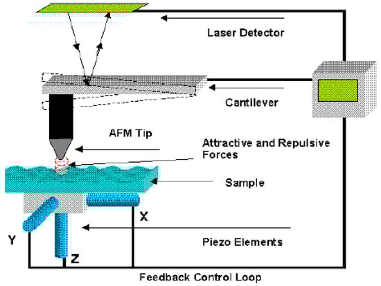 Advanced and micro-scale equipment have been recently applied to evaluate the ageing phenomena of asphalt such as SEM, AFM, and FM [117]. Table 4 provides a performance comparison between AFM, SEM, and transmission electron microscopy (TEM). Among them, the bee-like structure obtained by an AFM is a hotspot in terms of the ageing of asphalt (working principle, Figure 11) [118].