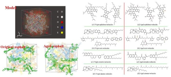 As a novel digital tool, the molecular dynamic method was applied in the analysis of the physicochemical properties of asphalt materials [118,119,126,127,128,129,130,131]. Li et al. [132] utilised the asphalt molecular dynamics model to investigate the change in the physicochemical properties of asphalt caused by ageing. Xu et al. [58], Yang et al. [133], and Lei et al. [74] established an aging asphalt model by introducing oxygen-containing functional groups and using reactive molecular dynamics (MD) to simulate the oxidative aging behaviour of asphalt during long-term service. The changes in ketones, carbonyls, as well as sulfoxides during the ageing process were quantitatively analysed in the aspect of the nano-view (Figure 14), and the results essentially agree with laboratory testing results. Based on the MD model of AA-1 asphalt, Ding et al. [134] built an aged asphalt model by increasing the numbers of polar components such as asphaltene and reducing nonpolar components (such as saturates and aromatics). The diffusion behaviour of asphalt before and after oxidative aging was simulated. It was found that the ageing of asphalt increases the molecular interaction and glass transition temperature, slows down the molecular diffusion, and, as a consequence, the glass transition temperature increase during the ageing process.