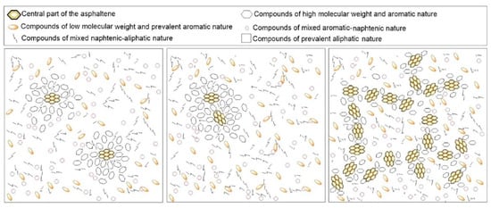 Asphalt is a colloidal system (Figure 15), in which the asphaltene is encapsulated by the colloid and dispersed in the light components (saturated and aromatic). According to the colloid structure theory, the concentration of the dispersed phase (asphaltene) determines the rheology of asphalt [108]. The aging effect in asphalt leads to the conversion of aromatic hydrocarbons and resins into asphaltenes, which leads to changes in the colloidal structure and affects the rheological properties [8]. There is a good correlation between the ratio of the soft and hard components and rheological indices. Chen Huaxin et al. [137] established a grey correlation between asphaltenes, gums, aromatic components, saturated components, and rheological properties and proved that asphaltenes have the greatest impact on asphalt viscosity. In addition, Salehfard et al. [138] measured the relative content of internal chemical components before and after asphalt aging based on TLC-FID and calculated the colloidal instability coefficient (IC); the results showed that the IC is closely related to the rheological properties of asphalt and this is the reason why the change in asphalt viscosity and the complex modulus based on IC.