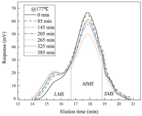 Research has still yet to disclose the specific molecular composition of asphalt owing to its complexity, which varies between different types of asphalt. It is believed that asphalt is an “extremely-complex fluid” with 105 to 106 types of non-reproducible molecular [124]. Furthermore, it was reported that the aging of asphalt includes an occurrence of chemical reactions, through which the molecular weight increases and the distribution of molecules is rearranged, leading to the hardening of asphalt. Gel permeation chromatography (GPC) is an ideal tool to measure the changes in the molecular weight distribution of asphalt before and after ageing (Figure 13).