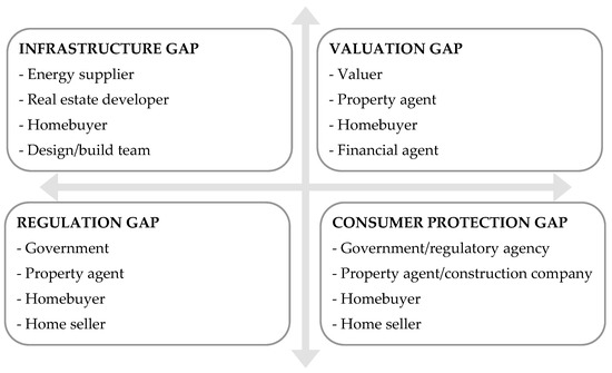 An enormous amount of information is generated and used during a building’s life cycle. Agents in different temporal or hierarchical stages of the life cycle use this information for the benefit of their activities and the correct functioning of specific processes. However, much of the information that is produced is “created” multiple times due to a lack of coordination between the parties. Usually, the benefits of this information are diluted without the parties being aware of it. When information is generated in isolation, an information gap arises. According to Miller et al. [18], these gaps (Figure 1) are confined to four key relationships: infrastructure, valuation, regulation and consumer protection.