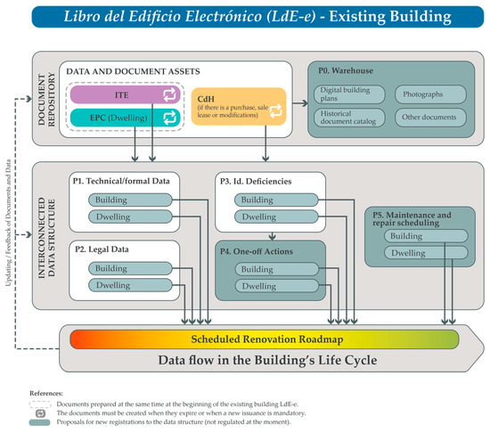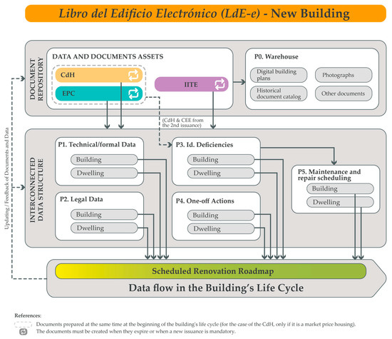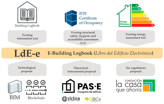 Based on feedback from the expert panel, the structure of the proposed LdE-e was determined by reinterpreting the data in existing building information tools (Section 3.1.1), adapting the theoretical–instrumental and normative proposals put forward by Spanish agencies (Section 3.1.2 and Section 3.1.3) and considering methodologies/technologies (Section 3.1.4) that can facilitate access to information by homeowners and stakeholders.