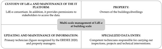 The proposal for the structure of LdE-e is based on the study of existing building information management tools, theoretical and instrumental proposals and regulations posted by Spanish organizations and the consideration of methodologies/technologies that can facilitate access to information by owners or stakeholders. Therefore, the initial elements that give rise to the LdE-e (Figure 2), depending on their data contribution, are the following.