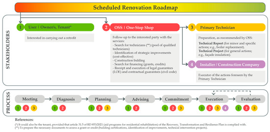 Proper building information management is an important element for the success of these strategies, since to communicate conventional or energy efficiency aspects of buildings, stakeholders must be convinced that what is presented as “efficient” really is so. For this purpose, the European Union (EU) has envisaged the introduction of two instruments: the Building Renovation Passport (BRP) (as a tool to enable buildings to increase their energy performance through a Scheduled Renovations Roadmap, SRR) through the Energy Performance of Buildings Directive (EPBD) (EU) 2018/844 [6]; and the Digital Building Logbook (DBL) (which is presented as a repository of relevant building data, including energy data, to facilitate informed decision-making and data sharing among stakeholders) through the recent Renovation Wave strategy [7]. Although they were presented in different years (BPR in 2018 and DBL in 2020), the relationship between the instruments is elementary, since the DBL constitutes the documentary basis of conventional and energy-related data of the BRP that is required to build the SRR.