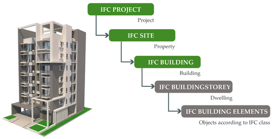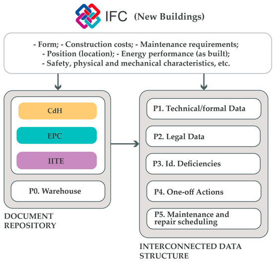 - P2. Legal data. This contains data on the agents involved throughout the building’s life cycle, data on ownership (building and dwellings), and data on potential information requesters (as part of control on the provision of data to stakeholders);