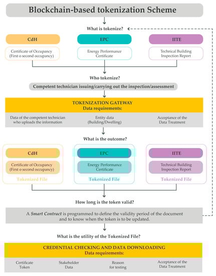 - Blockchain technology. The rationale for using blockchain in a BRP addresses the problem of a possible lack of trust between stakeholders and achieving an honest system without the involvement of a direct intermediary [45]. Recent studies have argued the importance of the use of blockchain in the development of a BRP due to the dynamic behavior of information throughout the life cycle of buildings and the need for rigorous updating processes (blockchain-based smart contracts could be useful for implementing mandatory improvements resulting from IITE with deficiencies rated as “serious” or “very serious”) [46].