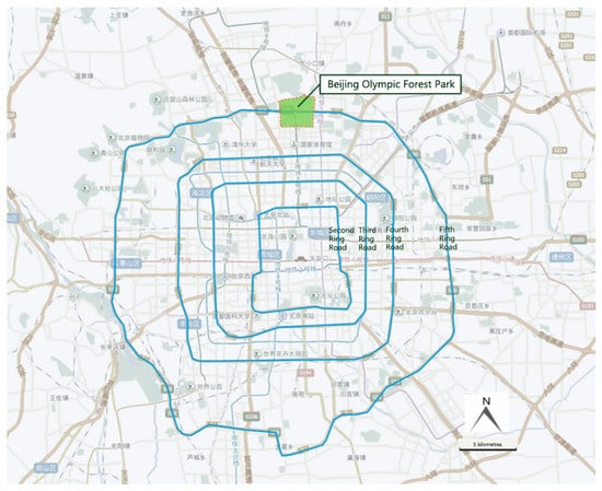 The main green space areas in BOFP are located in Chaoyang district, Beijing (Figure 1). They extend from Kehui Road in the south to Qinghe in the north (across the North Fifth Ring Road), east to Anli Road and west to Lincui Road. The park covers a total area of 680 hectares, of which the southern part covers about 380 hectares (including a venue area in the west) and the northern part covers about 300 hectares.