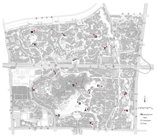 Using the chessboard sampling method, 17 experimental sample points were selected in the green space of BOFP (Figure 2 and Table 1). To ensure that the test sample points were far away from large-scale crowd activity areas (urban roads, squares, etc.), representative vegetation types were selected to fine-tune their positions []. The types and number of plant community structures covered more than three test sites. The two comparison samples were located in the Beijing Olympic Park paved square (near the underground business district), 1 km south of the south gate of BOFP; and in a paved square on the north side of the north fourth ring road of BOFP (near Beijing’s Bird’s Nest National Stadium). Compared with the former, the latter site has more hard pavement, less green space, less diverse plant communities, and more dense crowd activities.