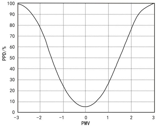 In Formula (2), when the PMV value is 0, the PPD value is not also 0, because regardless of how comfortable the objective environment is, people’s physical comfort is affected by multiple subjective and objective factors beyond the environment, such as physiological and psychological factors. It was assumed here that even when the objective environment was at its most comfortable, 5% of people would still be dissatisfied (i.e., PPD = 5%).