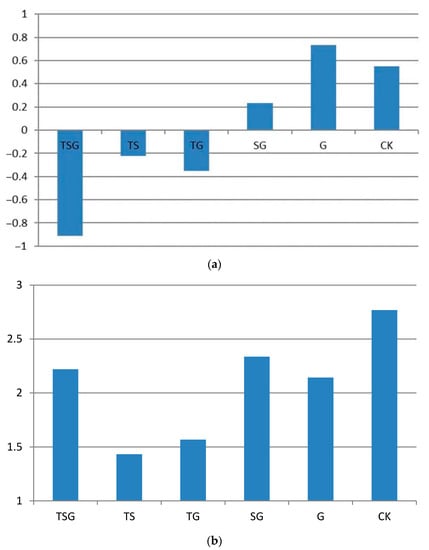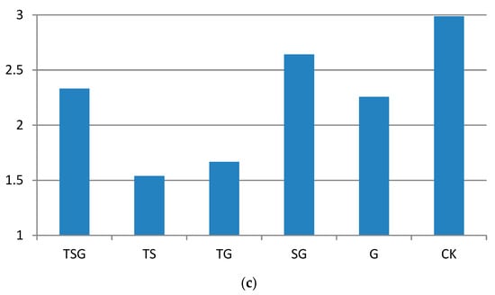 Figure 4 (including Figure 4a–c) and Figure 5, respectively, show the instantaneous values and mean values of human thermal sensation in areas of green space with different green plant community structures. As shown in Figure 2, the level of morning instantaneous somatosensory comfort in the areas with TG, TS, SG, and G community structures was high. However, TG and TS show negative values in the figure, indicating “cool comfort”, while the SG and G areas were associated with “warm comfort”. As the SG and G community structure areas were directly exposed to solar radiation in the local plant community areas, their temperature rose quickly, while the TS and TG community structure areas did not receive much direct irradiation from sunlight due to their dense forest canopy, resulting in a slow rise in air temperature. The comparison sample also showed a rapid temperature rise, with its areas associated with “warm comfort”. The results shown in Figure 4b,c are very similar, illustrating a gradual intensification of thermal sensation (from noon instantaneous to afternoon instantaneous), reaching the level of “thermal discomfort” before the end of the test and remaining at this level after the test.