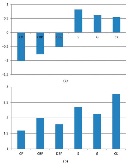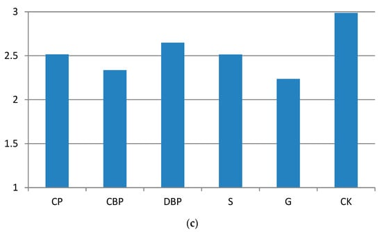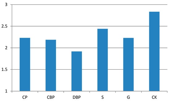 Figure 6 (including Figure 6a–c) and Figure 7, respectively, show the instantaneous values and mean values of perceived bodily heat across the five green plant community types. As shown in Figure 4a, all five community type areas felt comfortable in the morning. Among them, the S and G community type areas were associated with “warm comfort”, while the CP, DBP, and CBP community type areas were associated with “cool comfort”. The reason for the “warm comfort” experienced in S and G may have been that the air in these areas was heated by direct solar radiation, while the DBP and CBP areas stayed cooler for longer due to their greater canopy closure. However, the CP community type area had small trees and thus no significant canopy coverage. Although direct solar radiation was strong in this area, according to the field observation, the regional environment was still experienced as cool. The reasons for this unexpected finding need to be further studied. The results in Figure 6b,c are similar, showing a continuous increase in thermal sensation from noon to afternoon. At noon (Figure 6b), some of the community type areas were still comfortable, but in the afternoon (Figure 6c), all of the community type areas were associated with “thermal discomfort”. As shown in Figure 5, the somatosensory comfort level in the DBP community type area was “thermal comfort”, while that in the other community type areas was “thermal discomfort”. The reasons for this finding also need to be further studied.