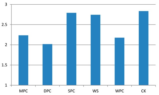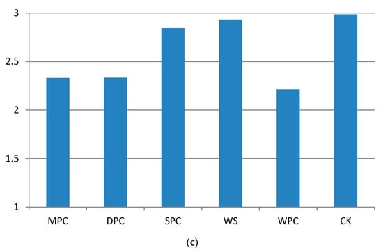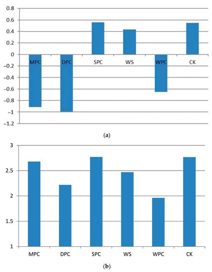 Figure 8 (including Figure 8a–c) and Figure 9, respectively, show the instantaneous values and mean values of thermal sensation in areas with different typical landscape environments. As shown in Figure 8a, all of the community types in the morning felt comfortable. The MPC, DPC, and WPC community structure areas were associated with “cool comfort”, while the SPC and WS community structure areas were associated with “warm comfort”. As the MPC community structure in this section is the same as the TSG community structure, the corresponding results are the same as those reported in Section 2.1. The results presented in Figure 8b,c are very similar, showing that thermal sensation in the typical landscape environment areas increased or remained roughly stable within the threshold range of “thermal discomfort” (2≤│PMV│≤3). The results in Figure 9 show that thermal sensation in the three landscape environments represented by the MPC, DPC, and WPC community structures ranged from “thermal comfort” to “thermal discomfort”. The WPC community area showed similar characteristics to the DPC community area, which may have been due to its open space and proximity to a water body, which is conducive to ventilation. The two landscape environments of SPC and WS were associated with significant “thermal discomfort”, as they were subject to strong direct solar radiation.