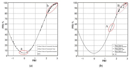(a). PMV–PPD instantaneous value/mean fitting. (b) PMV–PPD mean fitting. Index Value Fitting of PMV–PPD Body Comfort Across Landscape Types of Green Space. The red circle (a, b, c, A, B) in the Figure 10 shows the aggregation area of PMV-PPD mean value fitting points.