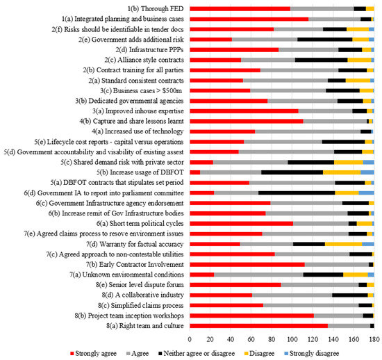 The questionnaire instrument, consisting of two sections, was explicitly designed for use in interviews with a sample of experts in infrastructure projects. While Section 1 sought demographic information on the respondents, Section 2 contained questions related to the themes and sub-themes identified from the literature review. The importance of each theme and sub-theme, expressed as propositions, was ranked by respondents using the following response categories: (1) strongly disagree, (2) disagree, (3) neither agree nor disagree, (4) agree, and (5) strongly agree. Each proposition was assessed against the mean score and net support, i.e., the number of respondents who agreed or strongly agreed as a percentage of total respondents. The research survey was undertaken over five months, from 1 May to 30 September 2019, with contributions from 180 respondents engaged in all aspects of major infrastructure delivery. Of the overall responses, 140 were obtained from the online survey, and 40 were collected in person. A sample size of over 100 is generally considered robust for questionnaire-based research [44].