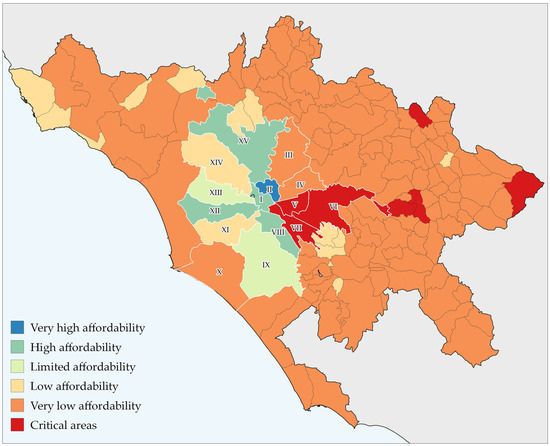 Therefore, in order to highlight the multidimensional nature of food security, not dwelling on single and isolated failures of the food system, this work cross-references the affordability maps with the maps concerning the presence of food retail outlets, with those on the presence of solidarity initiatives, highlighting the presence of the blacked-out food areas. As showed in Figure 12, the Metropolitan City is characterized by a preponderance of blacked-out food areas (dark red), whereas the situation improves only in the districts of the Municipality of Rome, especially in the city center (e.g., I and II).