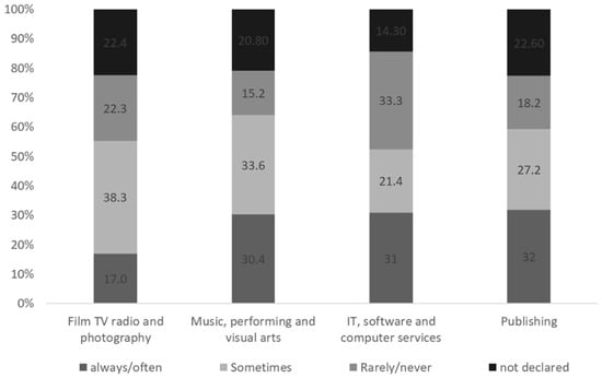 As revealed by the survey, the low presence of high-frequency green innovators in the audiovisual sector points to a reluctance—or unawareness— of Research & Development as a viable path to greening their sector [73]. Research & development remains in fact a potential route to green innovation, but not the only one [74]. Some businesses conduct research to improve business processes without necessarily resulting in commercial outputs. While this may reflect the nature of a sector which is often unfamiliar with R&D processes as a route to innovation (especially those that are not technology-based), the same could be said of other creative sectors, where enthusiasm for green innovation is higher. So, while most of the audiovisual companies in the Welsh sector are small, with limited access to R&D budgets, this is typical of the creative industries overall.