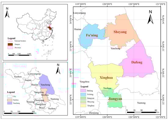 The data in this paper came from a survey in Taizhou and Yancheng of Jiangsu Province, China in May 2021, totally containing 39 villages. Jiangsu is one of the main rice producing areas in China, and conventional rice cultivation is mainly concentrated in northern Jiangsu and central Jiangsu, accounting for 94% of the total cultivated area of the province in 2020. Therefore, Taizhou, the representative city of central Jiangsu, and Yancheng, the representative city of northern Jiangsu, were selected as our preliminary survey sites. Then, stratified sampling was conducted, and a total of 39 villages in the two places were finally selected as survey sites. The distribution is shown in Figure 2.