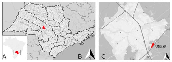 (A) São Paulo, Brazil; (B) Bauru city; (C) Location map of the UNESP campus in the city of Bauru. Source: (A,B) adapted from Júnior (2011) [29] and (C) adapted from Google (2021) [30].