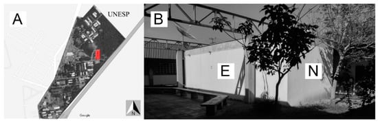 Location of the building on the university campus (A) and image of the east façade in front of the student lounge (B). Legend: E: east façade; N: north façade. Source: (A): adapted from Google (2021) [30]; (B): author’s file.