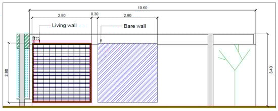 The experiment, consisting of a living wall, was built on the east façade of a building at the Faculty of Architecture, Arts, Communication, and Design that receives solar radiation from 8:00 to 12:00 and is used as a space for students to socialize (Figure 2). The façade was divided into parts, and two sample plots were established (with and without the living wall) with equal areas of 2.80 m × 2.80 m and spaced 30 cm apart from one another to avoid the influence of the edge effect, as shown in Figure 3.