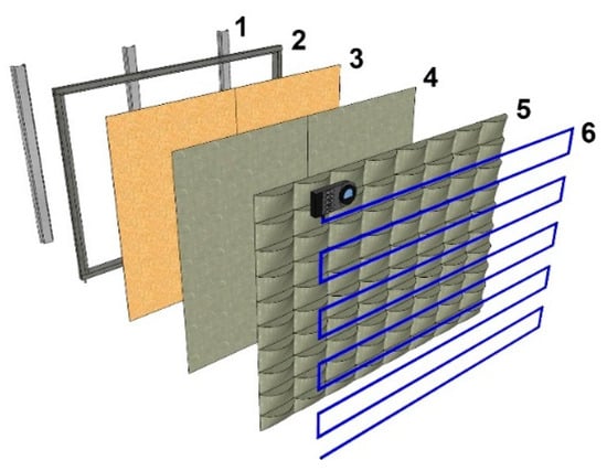 In this sense, the continuous living wall is a vertical garden system that stands out, because its final structure consists of numerous layers (i.e., structure + vegetation + air cavity) that shade the façade, add thermal resistance to the building envelope [12], act as an external thermal insulator, and allow the cultivation of several species with the roots growing freely [14,15].