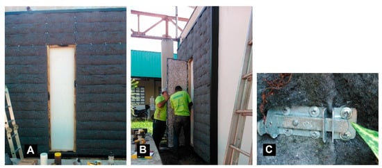 Continuous living wall with the central door being installed. Legend: (A,B) Installation of the central door that allowed access to the space between the living wall and the protected wall; (C) detail of the door-closing latches to prevent influence and heat entry by convection.