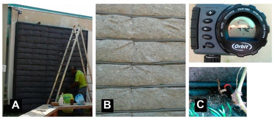 Irrigation system. Legend: Living wall irrigation system. (A) The orbit timer was positioned above the garden to avoid vandalism. (B) The hoses ran through all of the planting lines, and in each bag there was a drip button. (C) Timer and drip button details.