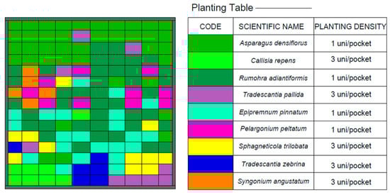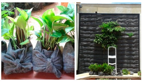The species used, planted in each pocket formed by the blanket, were chosen based on their characteristics of resistance to solar radiation: Asparagus densiflorus (Kunth) Jessop “Sprengeri”, Callisia repens (Jacq.) L., Rumohra adiantiformis (G. Forst).) Ching, Tradescantia pallida (Rose)DR Hunt, Epipremnum pinnatum (L.) Engl, Pelargonium peltatum (L.) L’Hér, Sphagneticola trilobata (L.) Pruski, Tradescantia zebrina Heynh.,and Syngonium angustatum Schott [35] (Figure 7).