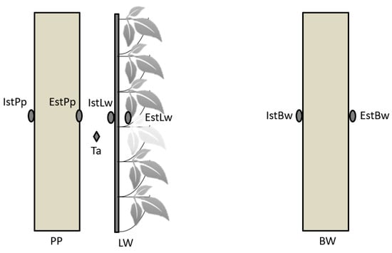 Distribution of surface temperature equipment. Legend: PP: protected wall (protected plot); LW: living wall; BW: bare wall (control plot); IstPp: internal surface temperature of the protected wall; EstPp: external surface temperature of the protected wall; IstLw: internal surface temperature of the living wall; EstLw: external surface temperature of the living wall; IstBw: internal surface temperature of the bare wall; EstBw: external surface temperature of the bare wall; Ta: air temperature.