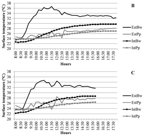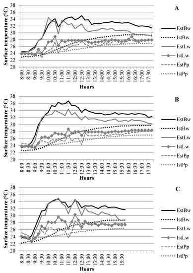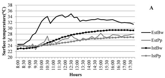 The surface temperatures of the “garden-protected plot” system were lower than the EstBw on the 1st day of monitoring and higher on the other days until 8:30 (i.e., the beginning of direct sunlight). From that time on, IstLw, EstPp, and IstPp were lower than EstBw, while they were lower than IstBw from 12:15 until the end of the monitoring period.