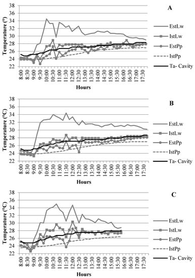 Relationship between surface temperatures along the garden-façade system and cavity air temperature on the 1st day. Legend: (A) 1st day; (B) 2nd day; (C) 3rd day. EstLW: external surface temperature of the living wall; IstLw: internal surface temperature of the living wall; EstPp: external surface temperature of the protected plot; IstPp: internal surface temperature of the protected plot; Ta-Cavity: cavity air temperature.